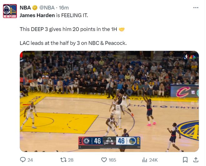 哈登上半场是火力全开,超远的转换三分都命中,单是第一节哈登就单节拿到13分,上半场拿到20分但是没有助攻,这是哈登自19火箭时期后首次出现,难道19哈登归位了?